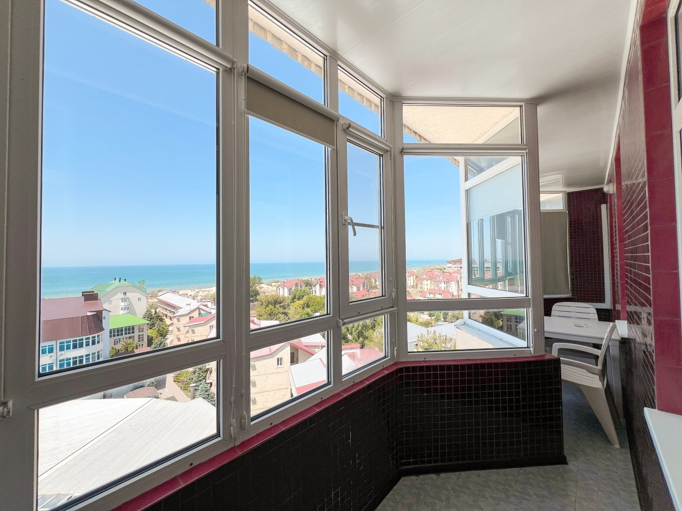 Уютная лоджия с панорамными окнами с летней мебелью, прекрасным видом на город и море.