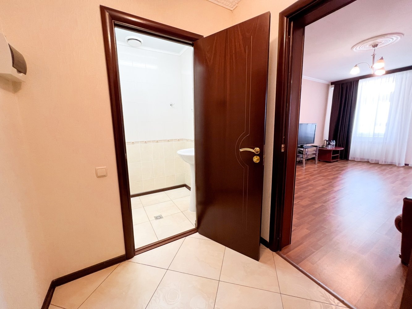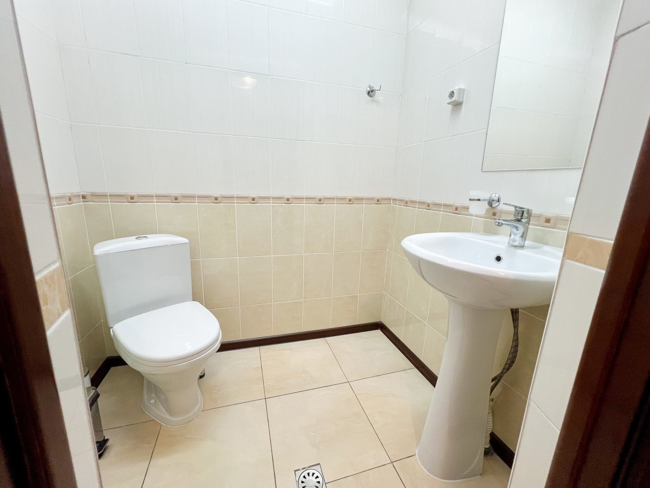 Санузел оборудован душевой кабиной, унитазом, биде, раковиной с зеркалом и феном.