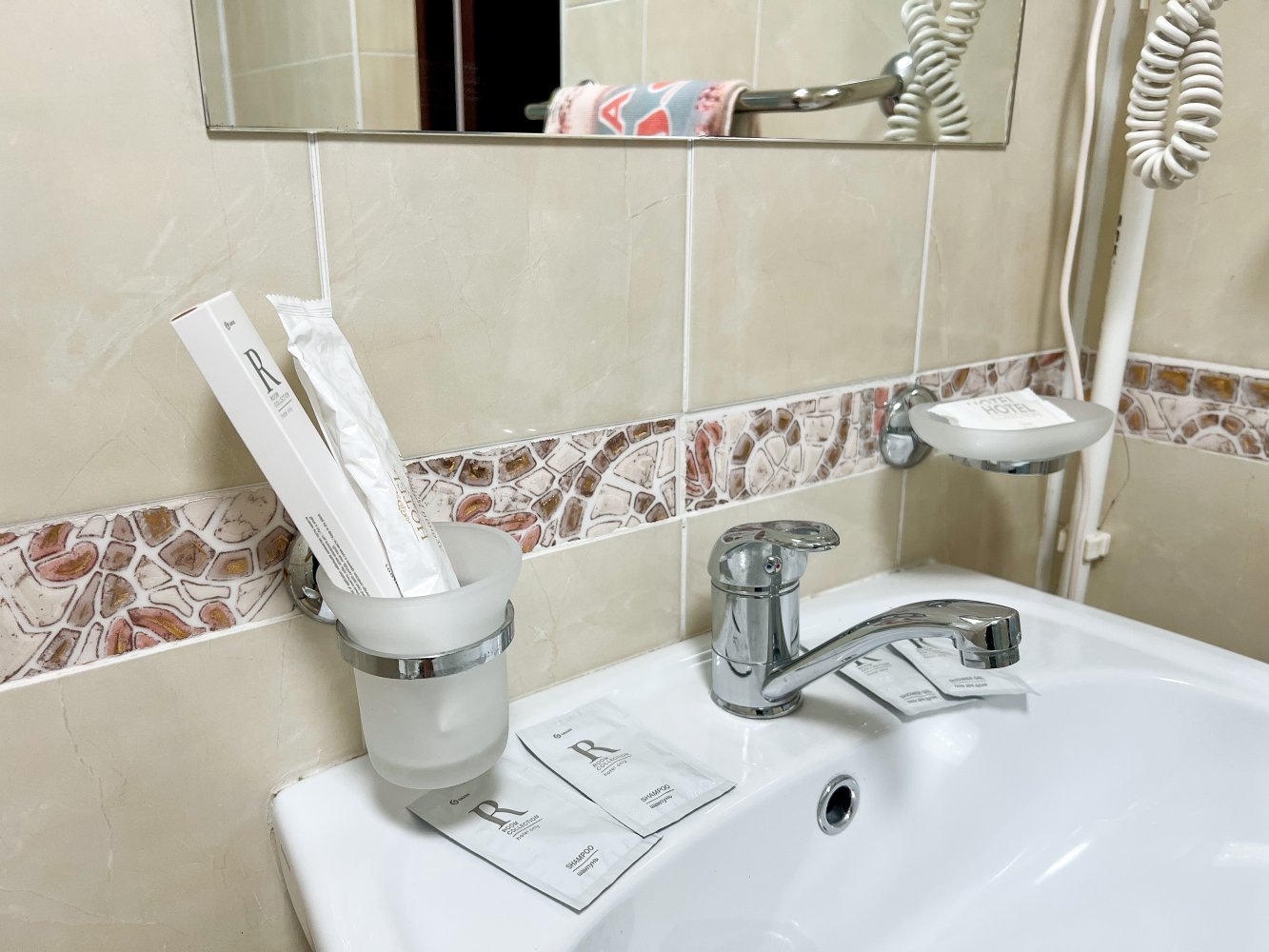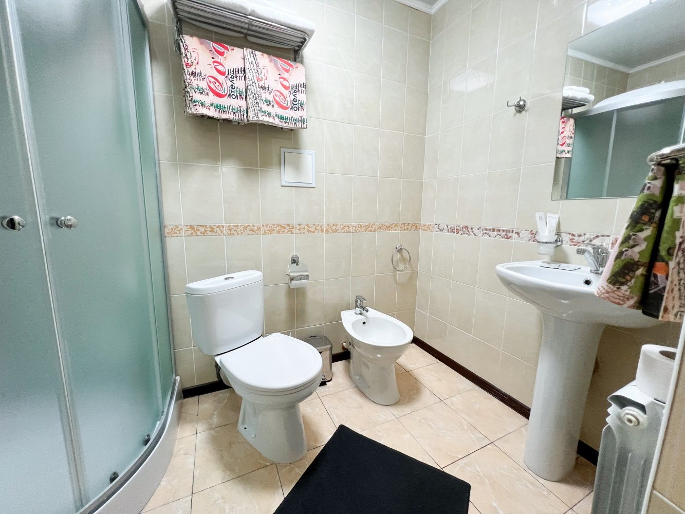 Санузел оборудован душевой кабиной, унитазом, биде, раковиной с зеркалом и феном.