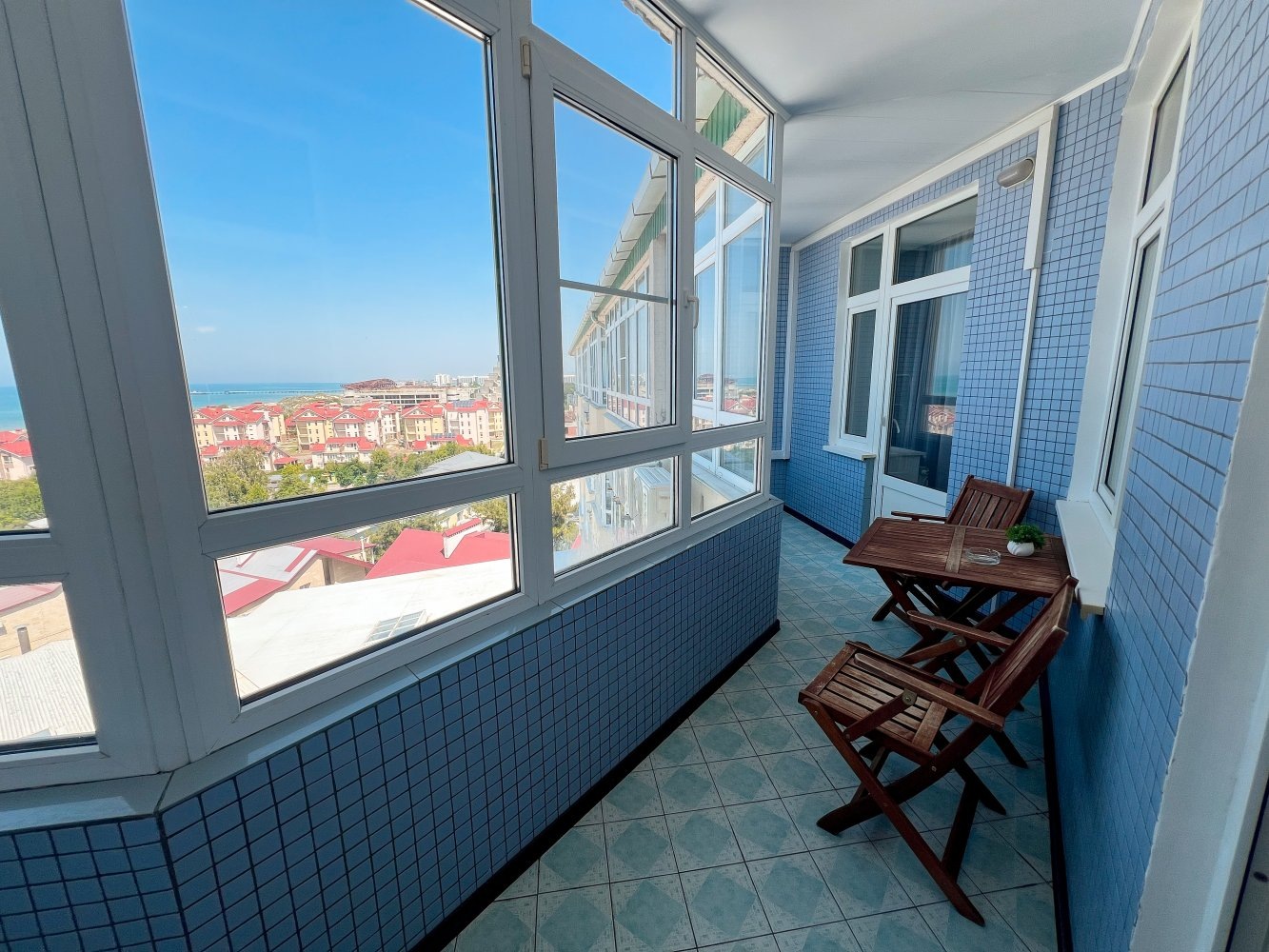 Уютная лоджия с панорамными окнами и летней мебелью, прекрасным видом на город и море.